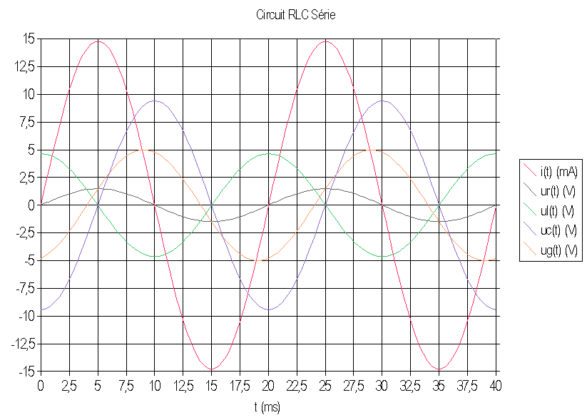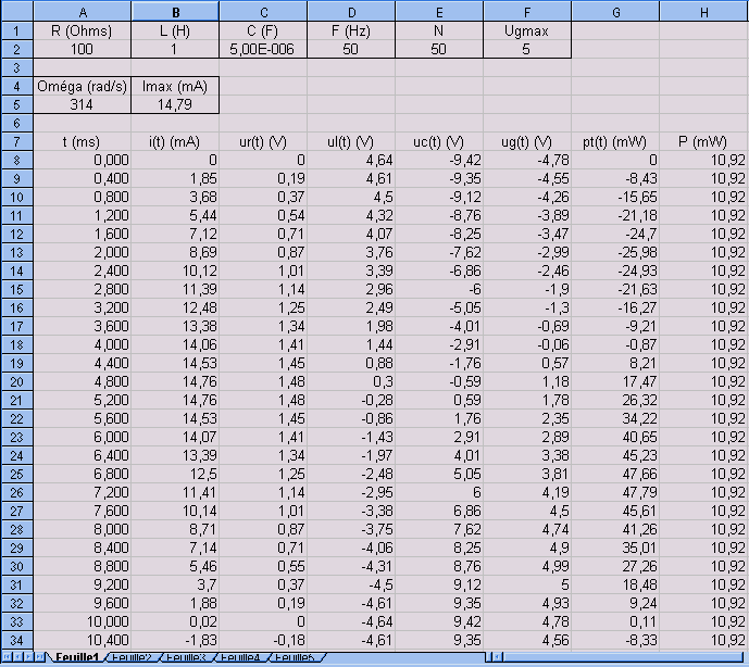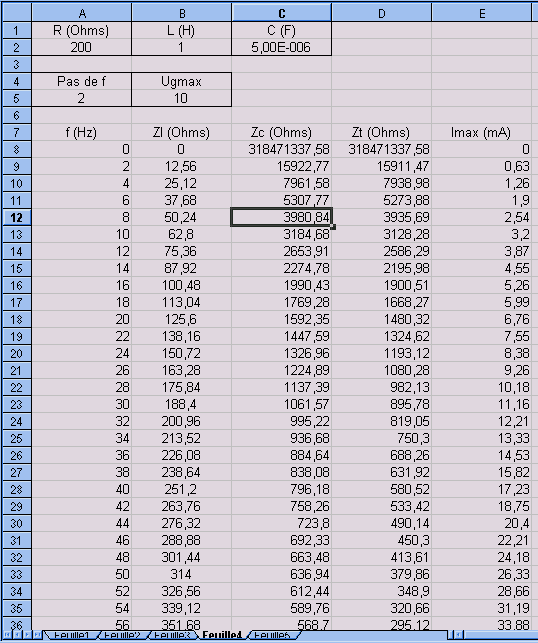 Cette simulation de circuit RLC série est basée sur un fichier préparé dans un tableur (Excel ou StarCalc le tableur gratuit de Sun).