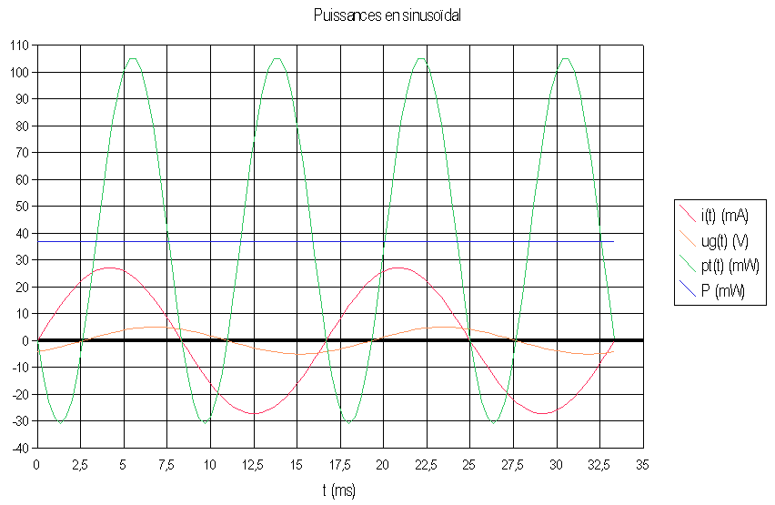 Puis, la courbe de la puissance instantannée et de sa valeur moyenne. La variation des paramètres du montage permet de bien montrer l'évolution de la puissance instantannée et de bien faire comprendre les notions de puissances actives, réactive et apparente :
